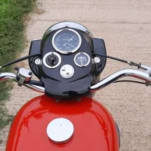 Not our usual fare but this very pretty Royal Enfield 250 Crusader has come into us as a p/x. Only recently purchased by the previous owner who unfortunately could not get on with the “British” right hand side gear change. The bike had been fully restored prior to him buying it and someone did a very good job as the bike is now very nice and it comes with a wad or receipts that show some of what has been spent. With a new battery and a bit of fettling it now runs and rides very well. The clutch, while working correctly, is heavy in use ( I had a quick “Google” and apparently this is not un-common). All the lighting,breaks etc work, tyres are still like new, cosmetically it is excellent. The odometer shows 393 miles so i am guessing this could be the mileage covered since its restoration? Good enough to adorn any man cave or to take to a show, cheap enough not to have to buy the wife a new kitchen! 😉