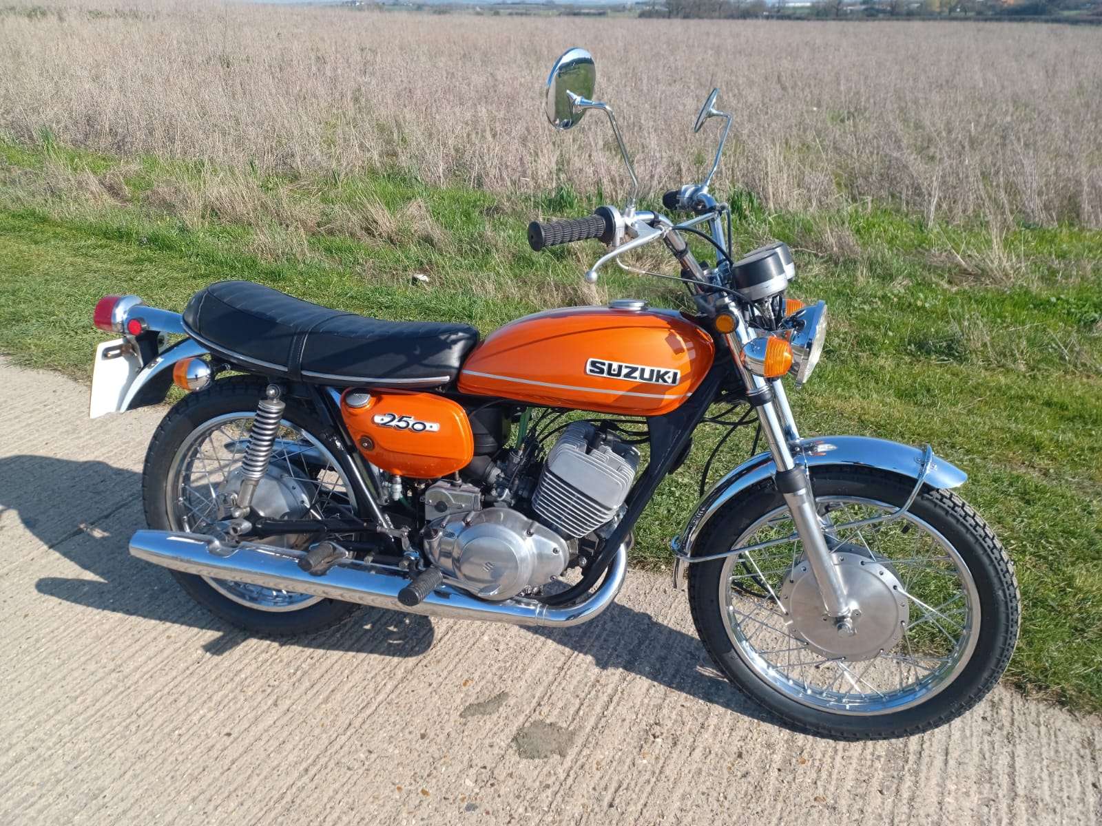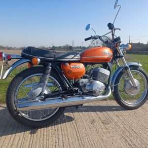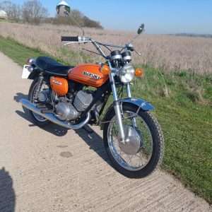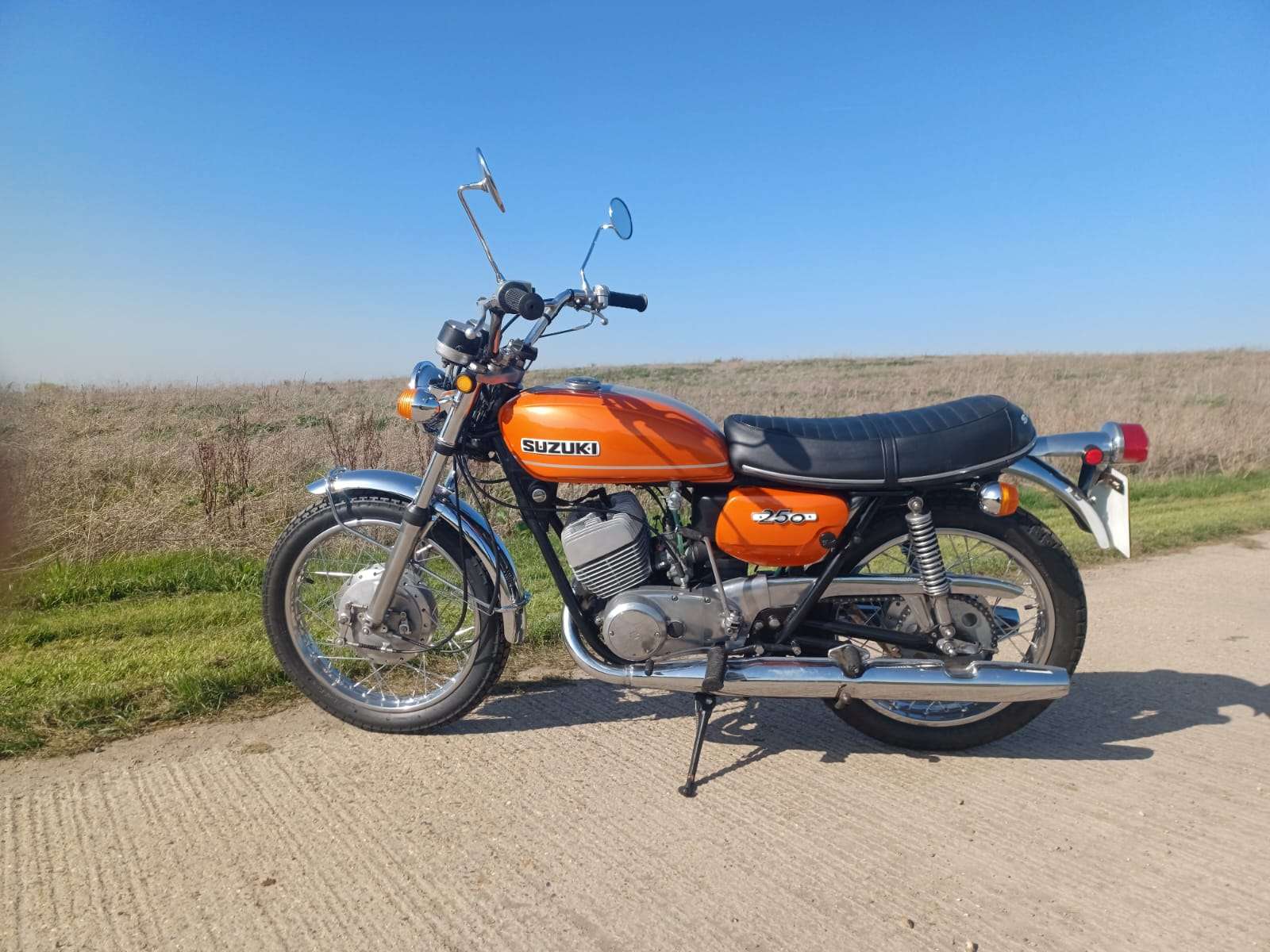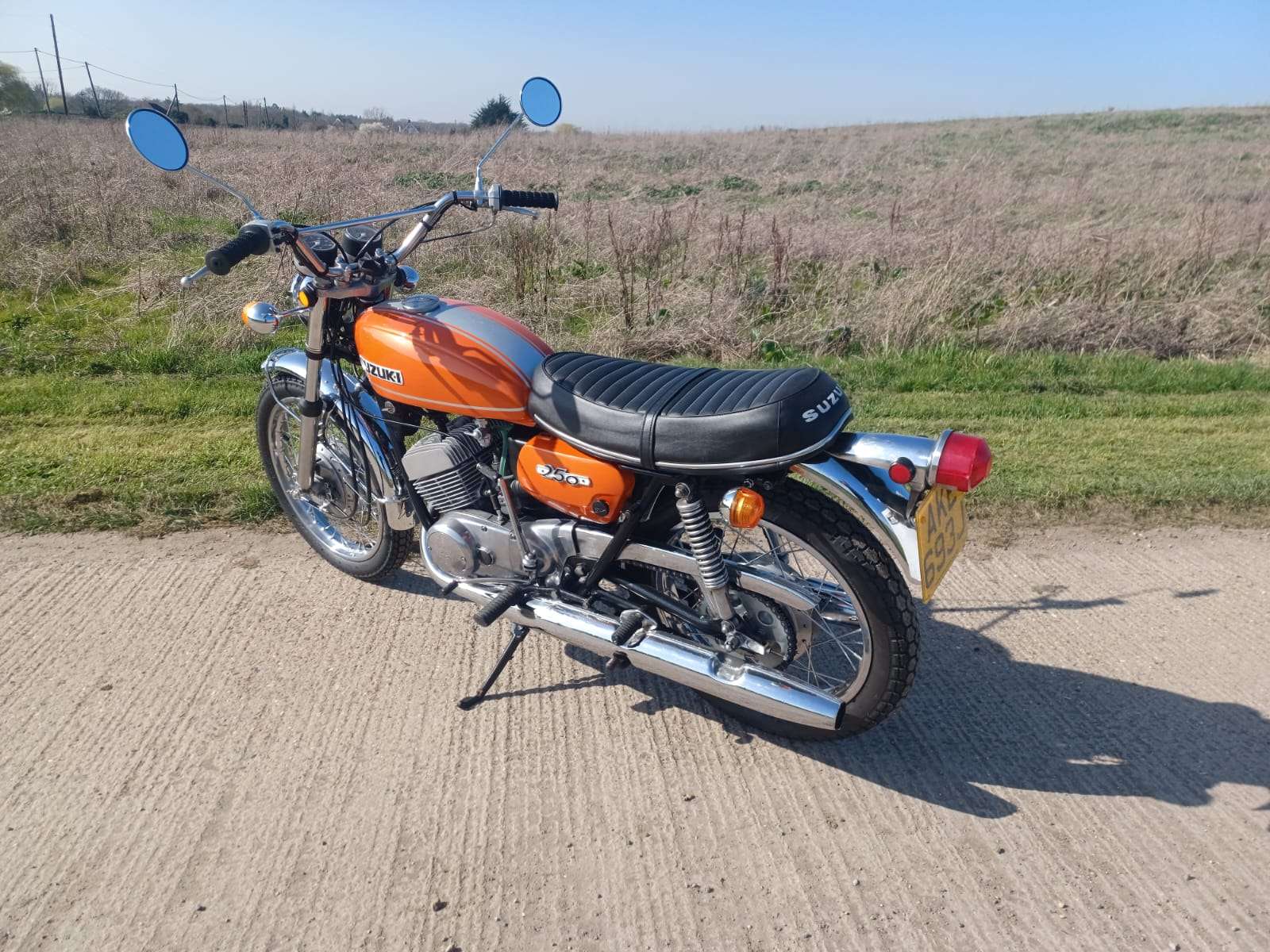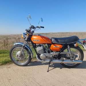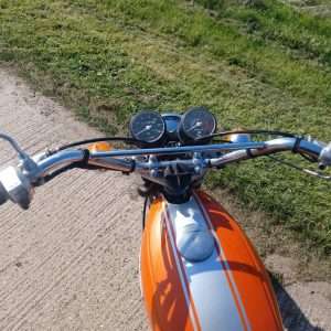Where do we start with this 1971 Suzuki T250 “Hustler”? Suffice to say that right now i wish i had a secretary as i hate this typing lark! Imported from Texas where the poor old thing had been left abandoned for so many years it was sun burnt and been left to get into a terrible state, but on the flip side there was no rust or rot. It had lost most of its chrome work and the fuel tank was doing a good impression of a Tetley t-bag where the old fuel had eaten it. Originally it was imported by someone we know, to break for parts but when i saw it, i felt sorry for it and throwing my cheque book out of the window, thought we can and will restore it. This decision was helped by the fact the engine was free and had great compression.