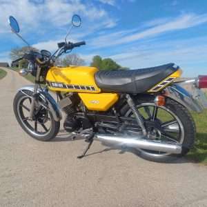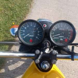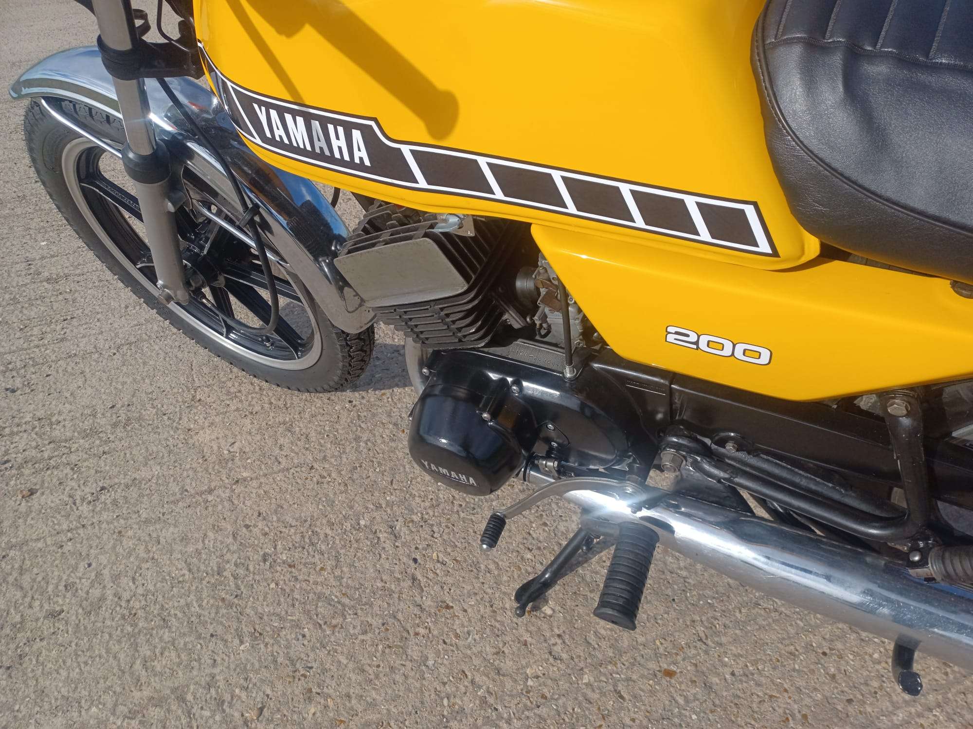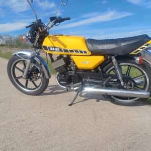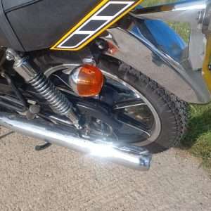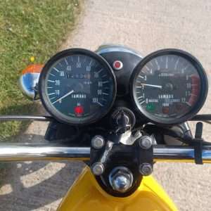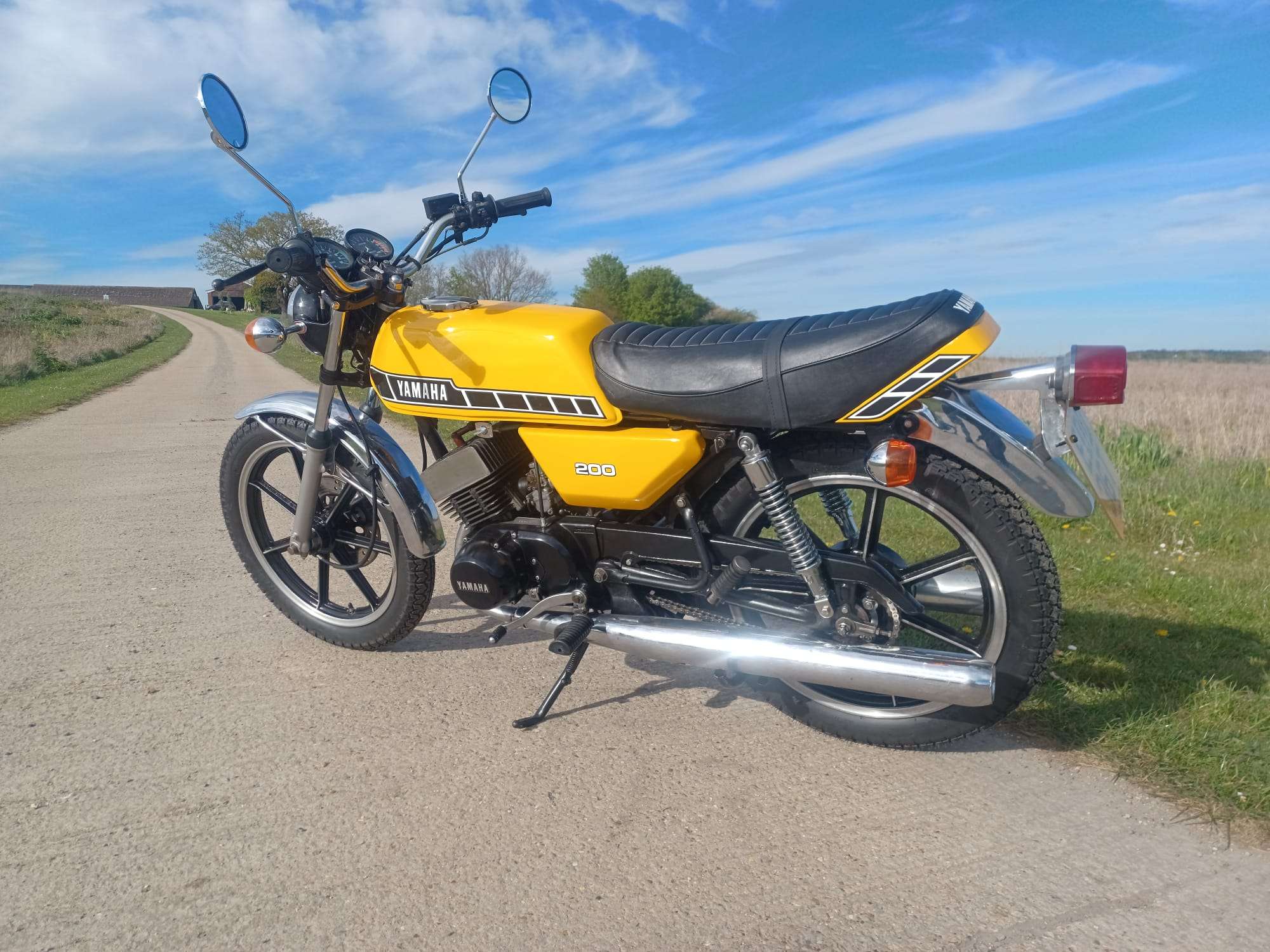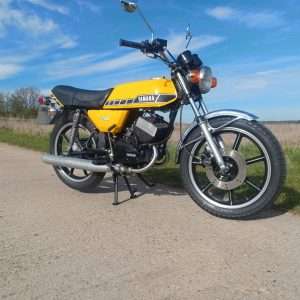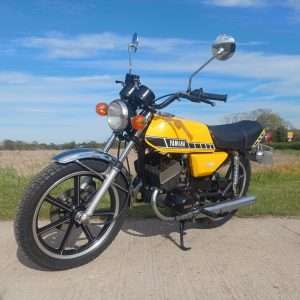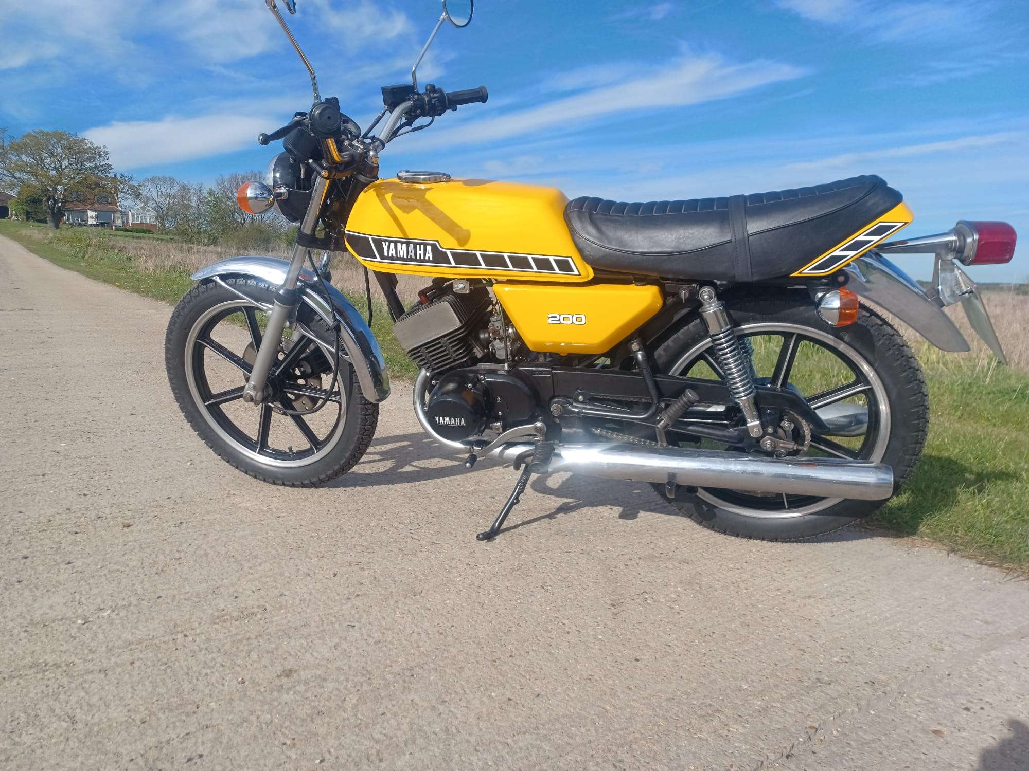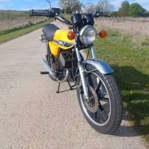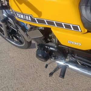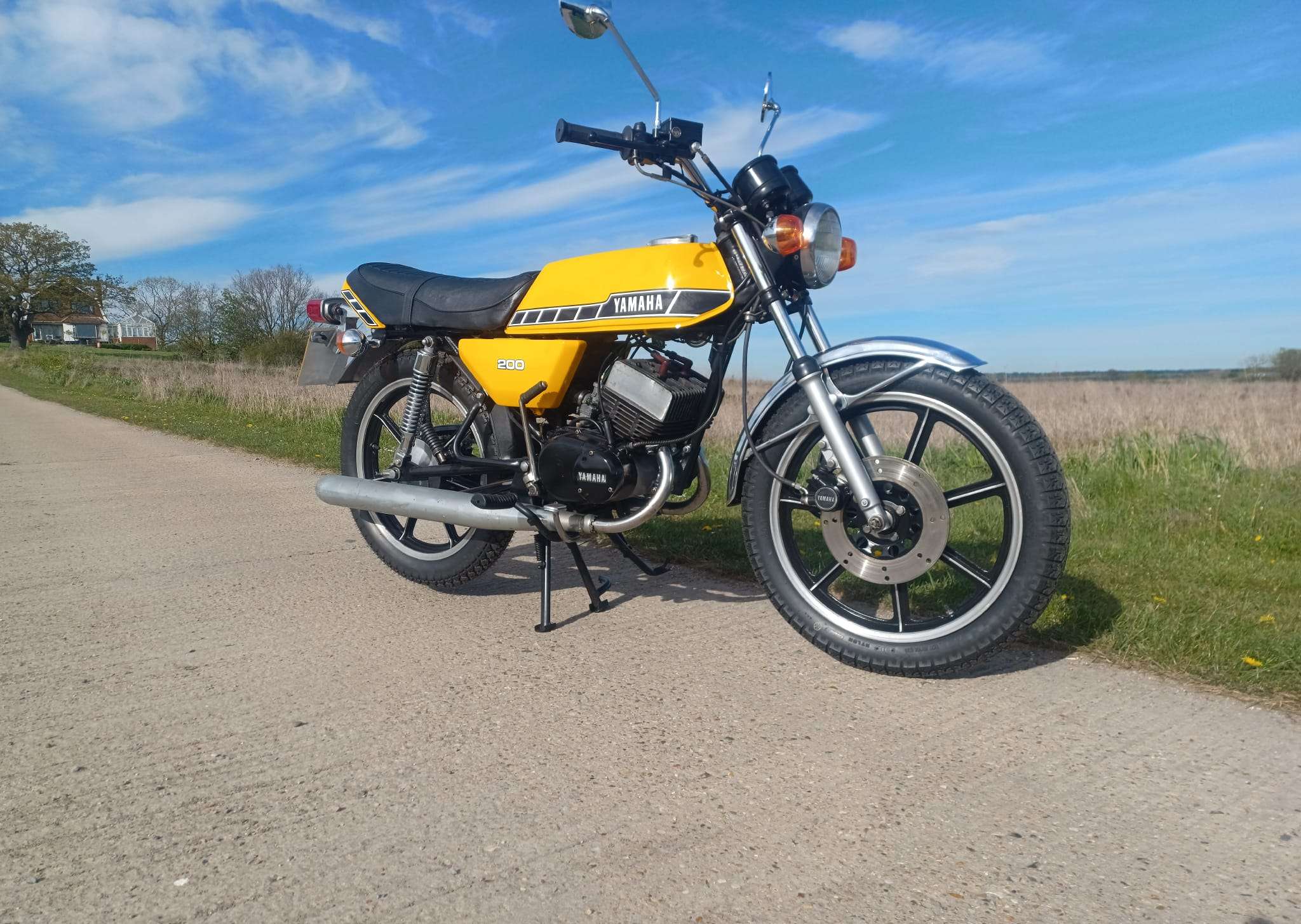But what we do have now is a very pretty 1979 RD200 thats fully functioning, yes “even” the electric start! That runs and rides very nicely. Cosmetics are very good apart from the original silencers have some dinks on and are a bit dull but hopefully priced sensibly enough for its new owner just to leave them as is, have seen far worse, or replace/rechrome them. Its a great wee bike that will put a smile on your face each time you see it. G